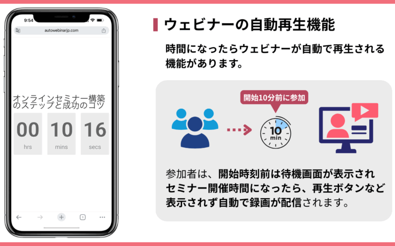 オートウェビナーJPでは録画していた動画を、ウェビナー参加者向けに自動で再生をさせる配信機能がついています。